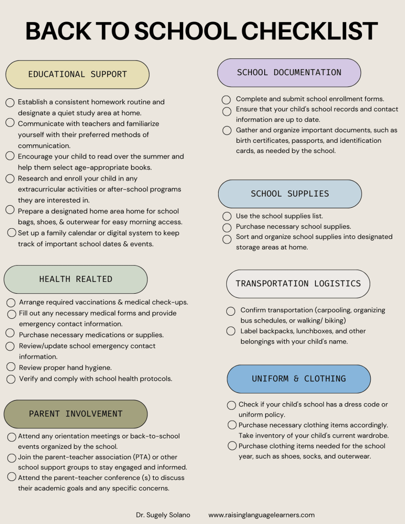 Lo tenemos cubierto, desde recolectar útiles escolares hasta garantizar su salud y seguridad. No espere hasta el último minuto: siga nuestra lista de verificación completa y prepare a su hijo para una transición sin problemas de regreso a la escuela.