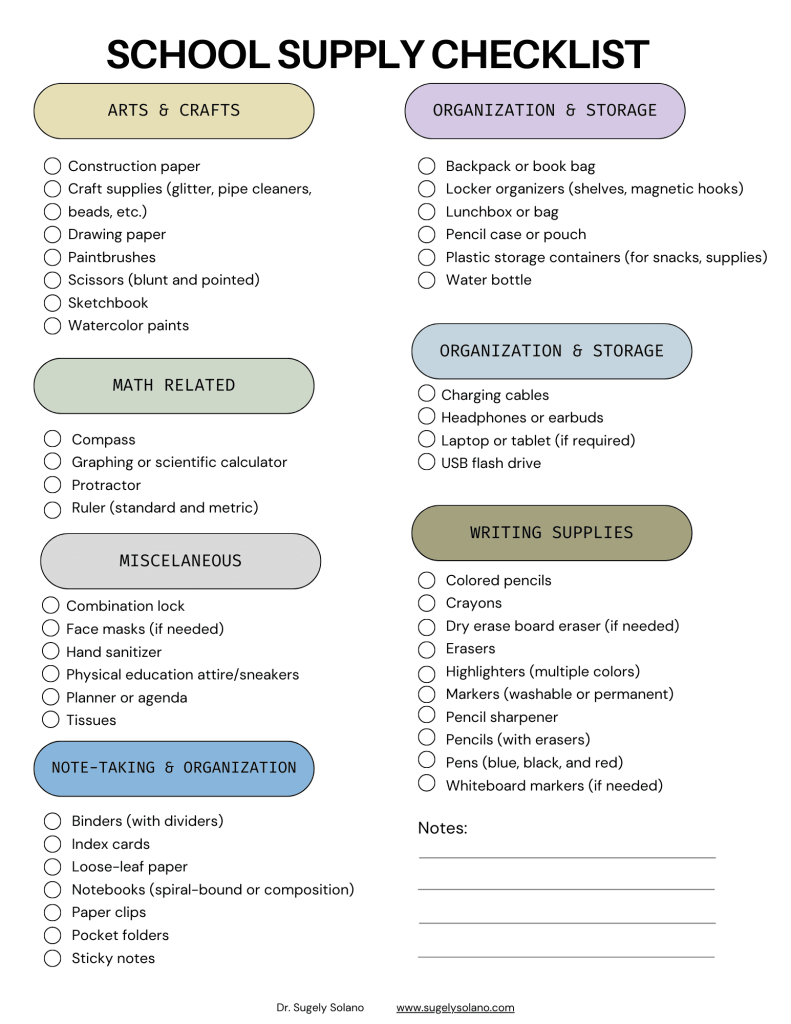 Nuevas listas de verificación para el regreso a la escuela Organice las tareas de los padres para ayudarlo a mantenerse enfocado. Use la lista de verificación de regreso a clases para prepararse para la temporada de regreso a clases y la lista de útiles escolares para realizar un seguimiento de las listas de suministros.