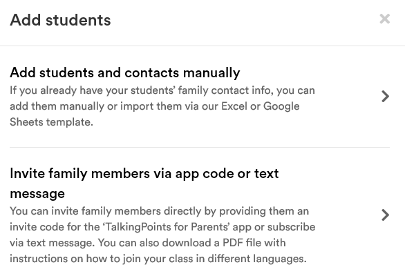 Click on option 1 – to Add Students & Contacts to manually add students/parents or select option 2 below – to Invite family members via app code or text message. See below.