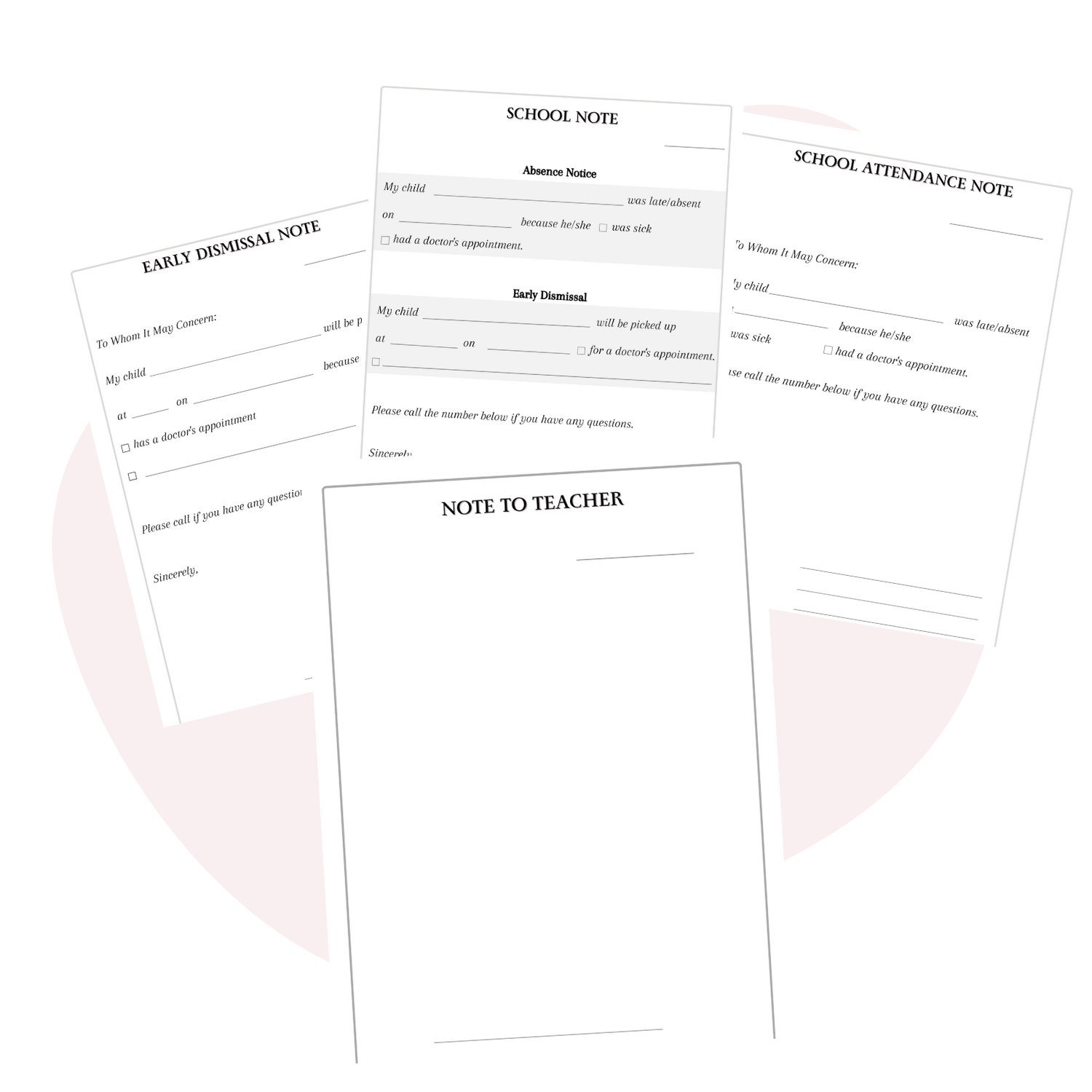 A child’s school record matters, and being absent or late must be documented in schools. Easily use and reuse these templates, and YOU WON’T NEED TO WRITE OUT A NOTE EACH TIME YOUR CHILD IS ABSENT OR LATE TO SCHOOL.
