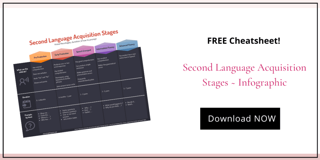 A critical factor during second language acquisition is a student’s awareness of the language development process. This is because a person’s awareness facilitates and contributes to language growth. Consider sharing these second language acquisition stages with language learners to support their learning experience.